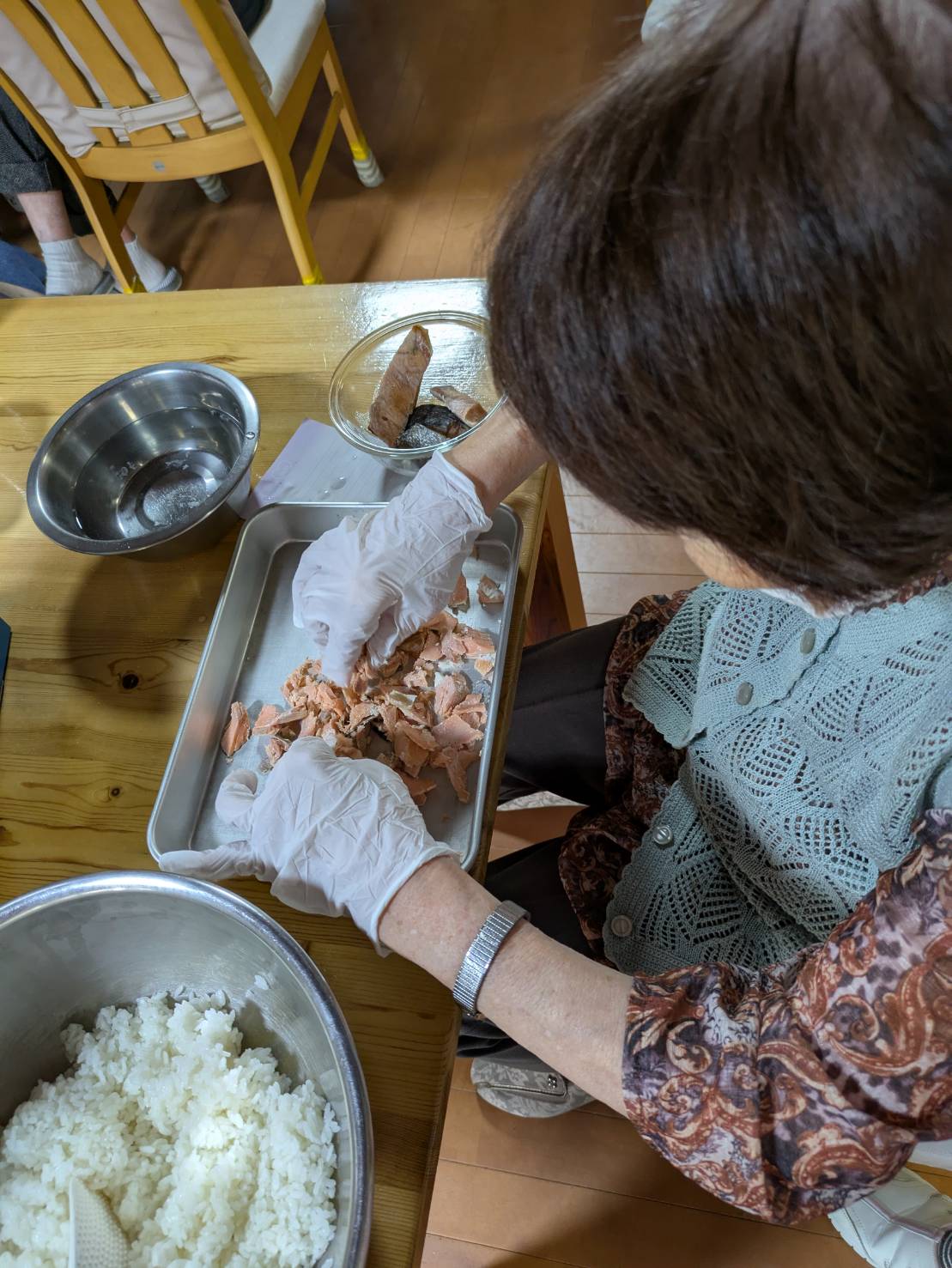 お米の炊き方から、酢の加減、鮭のほぐし方まで、利用者様にたくさんのアドバイスをいただきながら、一緒に作り上げました。
